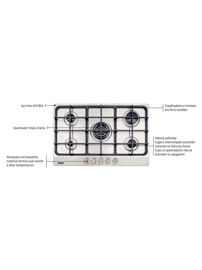 Sistema Safestop: atua interrompendo o gás automaticamente se a chama apagar, o que assegura uma operação mais segura no dia a dia.