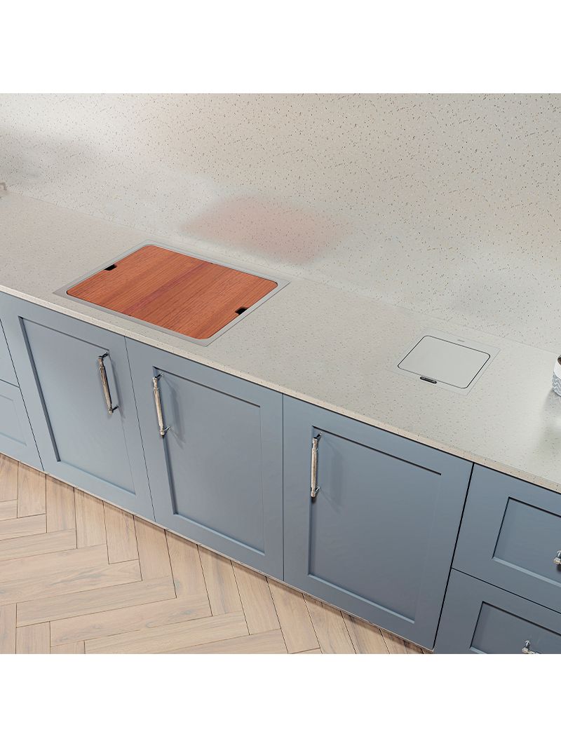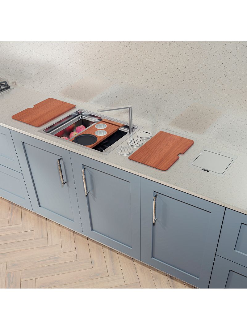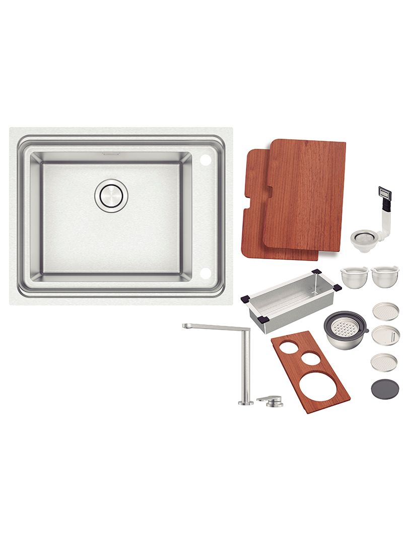 Acompanha acessórios: misturador monocomando Hidden, válvula com escape, 2 tábuas de madeira, cesto coador, tábua de madeira com encaixe para bowl ralador e dois bowls auxiliares. A combinação ideal para trazer mais funcionalidade e praticidade à cozinha.